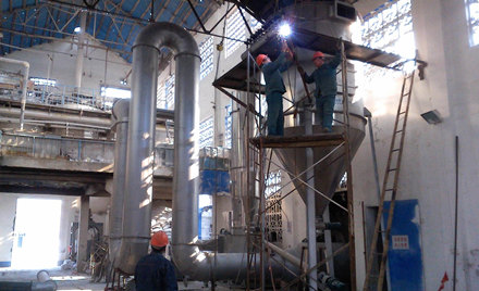 煅燒爐主要由氣體加熱器、氣固混合器、煅燒爐爐體,氣固分離收集器組成。預煅燒物料由氣固混合器送入爐內,同氣體加熱器加熱的熱空氣混合呈旋流態運動,煅燒過程在瞬間完成后,從煅燒爐出口進入氣固分離器,分離后的固體與氣體分別從排料口和排風口排出。