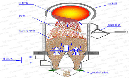 豎式冷卻器的結構:豎式冷卻器主要由鋼結構殼體,冷風帽,篦子裝置,出料裝置等組成。