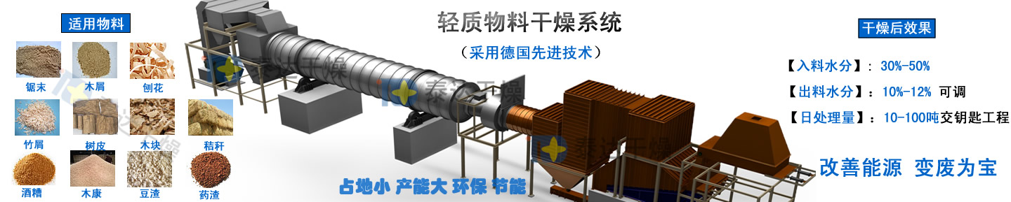 生物質干燥裝置主要有熱源部分、干燥機主機、進、出料部分、除塵部分、引風系統組成。熱源部分為整個干燥過程提供熱量,干燥機主機為生物質燃料換熱干燥的場所,除塵部分去除尾氣中的粉塵顆粒,減少煙塵排放,引風機提供熱風在整個干燥主機流動的動力。