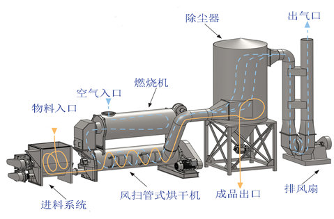 此烘干機(jī)將物料充分暴露于加熱過程中的氣流中,物料會(huì)在此過程中只留直至水分達(dá)到既定要求。風(fēng)掃管式烘干機(jī)包含三個(gè)不同區(qū)域,這三個(gè)區(qū)域各有不同的功能:這三個(gè)區(qū)域分別為入口區(qū),滯留區(qū)和卸料區(qū)。