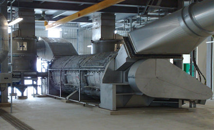 風(fēng)掃管式烘干機(jī)通常情況下通過可變速螺旋鉆或者泵直接伸入入口區(qū)。 一個(gè)特制的質(zhì)量流給料機(jī)和容積式螺旋相互協(xié)作。此裝置通用性極強(qiáng),甚至可處理極難處理的物料。烘干機(jī)臨近處或者上方設(shè)置有一個(gè)熱風(fēng)發(fā)生器,為烘干機(jī)入口處提供溫度高達(dá)600攝氏度的熱風(fēng)。此設(shè)備以天然氣為燃料,其他氣體或者油類也可用作其燃料。 燃料燃燒速度由烘干機(jī)卸料管中的溫度儀表控制。 此處的溫度決定了產(chǎn)品的殘留水分,因此常被用作整個(gè)工藝的定位點(diǎn)。空氣和干物料會(huì)通過出口管道離開烘干機(jī)到達(dá)旋風(fēng)或者帶式過濾器便于將物料與空氣分離。 之后,空氣會(huì)傳遞至經(jīng)主風(fēng)機(jī),產(chǎn)品也會(huì)從收集器卸出。顆粒狀物料收到重力作用會(huì)從烘干機(jī)卸料區(qū)卸出。產(chǎn)品溫度很少會(huì)超過60攝氏度。