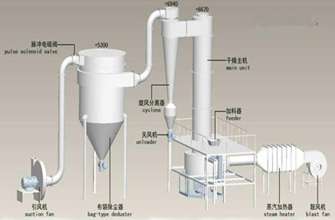 通過對加料、熱風溫度、分級器的調節,保證產品的濕含量及細度均勻一致,加熱器、加料器、攪拌破碎系統、分級器、干燥主管、旋風分離器、布袋除塵器、風機等組成。