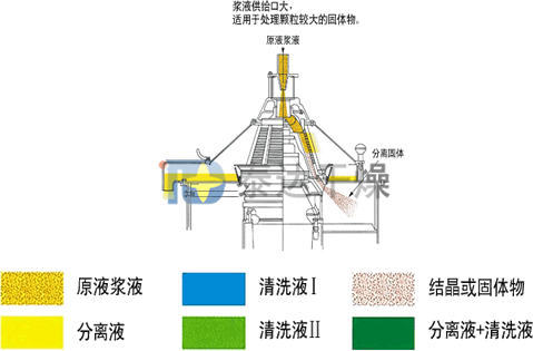 立式離心脫水機是利用機械旋轉(zhuǎn)產(chǎn)生的離心力,實現(xiàn)固液混合物分離,物料通過入料口,經(jīng)布料錐進入篩籃與刮刀之間的空間,在離心力的作用下,離心液透過物料層,穿過篩網(wǎng),沿上蓋流入機座上部的集水槽內(nèi),然后通過設(shè)在機座兩側(cè)的排液管排出機外,固體顆粒則保持在篩籃內(nèi)側(cè),因螺旋刮刀與篩籃之間有一轉(zhuǎn)速差,螺旋刮刀就將國體顆粒從篩網(wǎng)上刮下,并將其推送至篩籃底部,從而把脫水后的固體顆粒卸到機器下邊的收料漏斗里,這一過程連續(xù)不斷地進行。